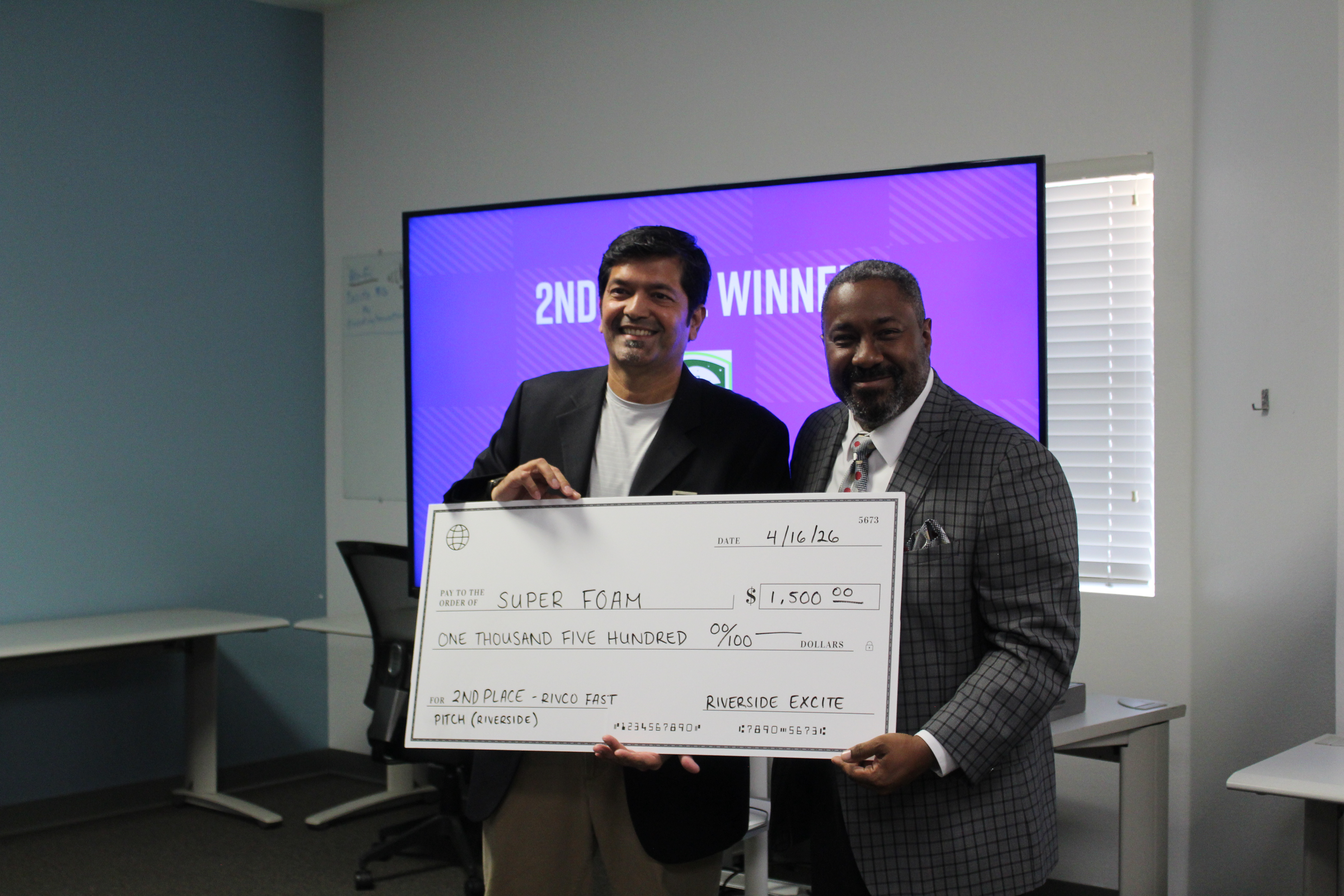 2nd Place Winner, Super Foam, represented by Zef Neemuchwala, holding a large check of $1,500 together with Tim Gramling, board member of Riverside ExCITE.